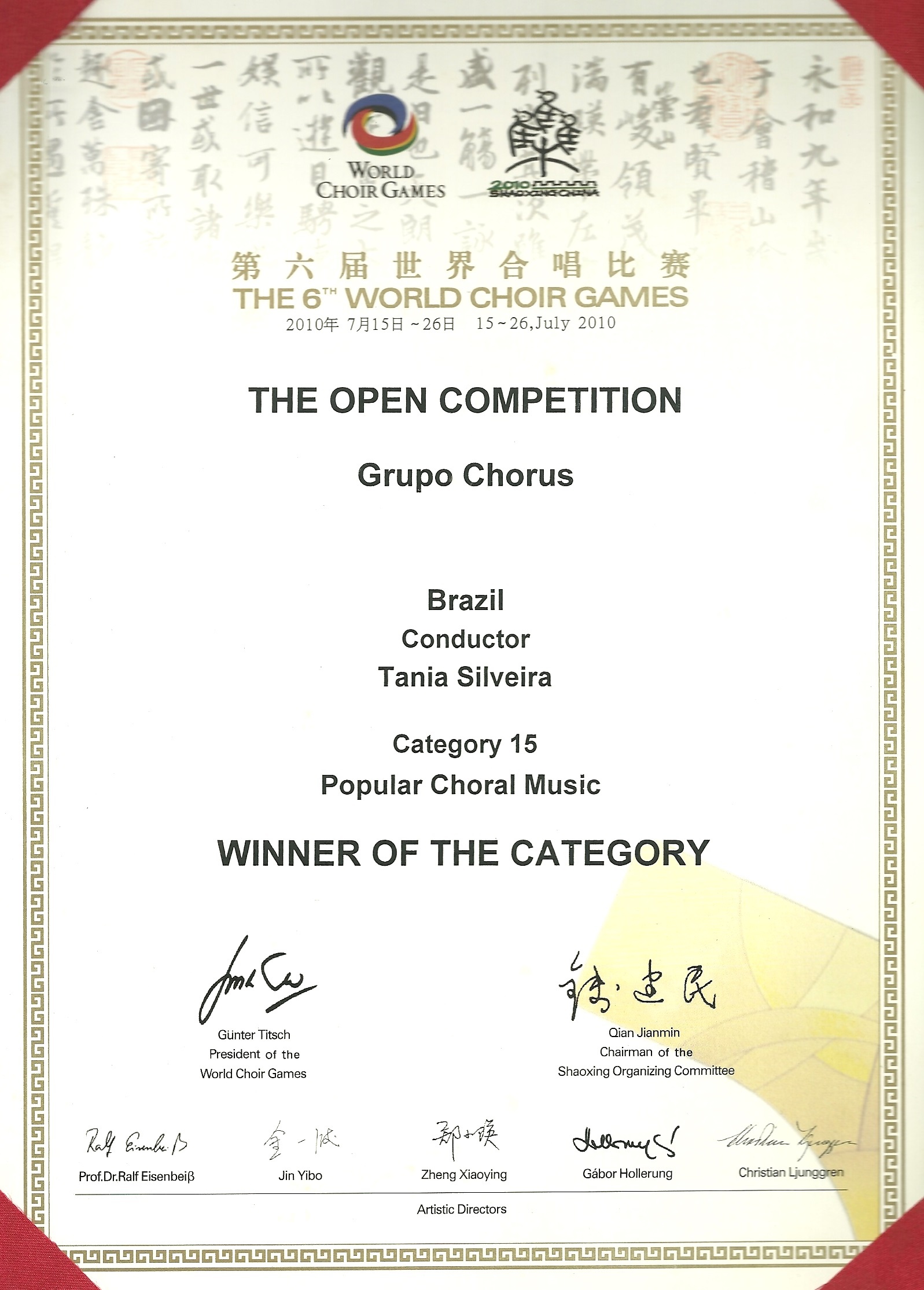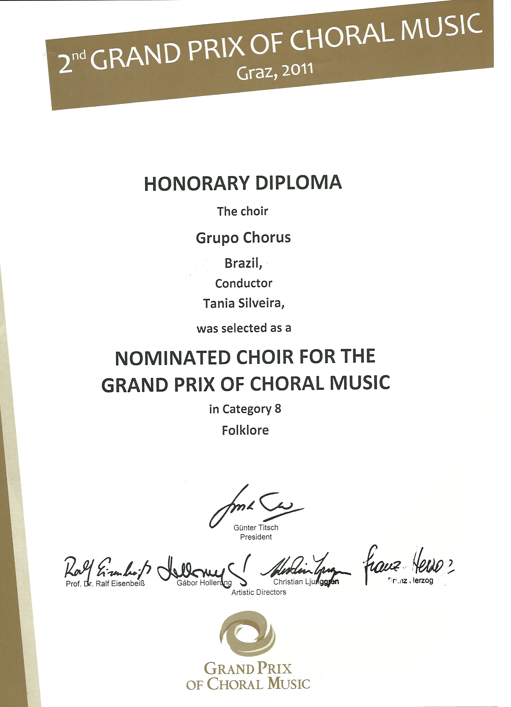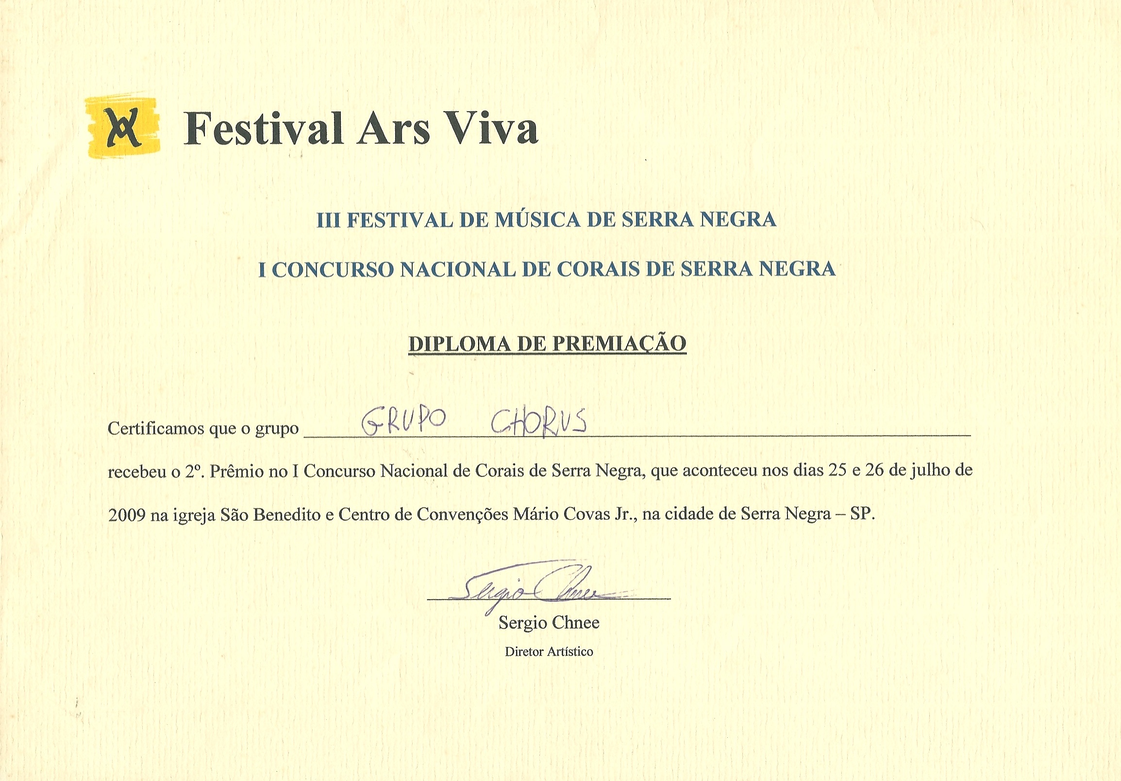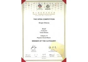 En su trayectoria, en que el destaque para la música brasileña fue y sigue siendo preservado, el Grupo Chorus tiene participado de inúmeros festivales y eventos de canto coral en Brasil y en otros países, en especial Argentina, Austria, Chile, China, Colombia, Uruguay y Venezuela, emocionando espectadores, coleccionando referencias elogiosas y honorables premiaciones. Entre ellas se destacan: en 2009, el “I Concurso Nacional de Corais”, en la ciudad de Serra Negra – SP, onde en disputa con 32 grupos de varias provincias conquisto el 2º lugar; en 2010, cuando integro de la conquista del primero lugar (Diploma de Oro) para Brasil por su participación en los “Sixth World Choir Games” (Juegos Mundiales del Canto), organizado por la “Interkultur Foundation” (de Alemana) en la ciudad de Shaoxing, China, en la categoría “Música Popular”, en que acorrerán cerca de 40 coros de vários países; en 2011 la conquista del 3º lugar en la categoría Pop/Jazz, en el “Grand Prix of Choral Music” en Graz, Austria, onde la disputa fue con los otros campeones del certamen de música realizado en China.